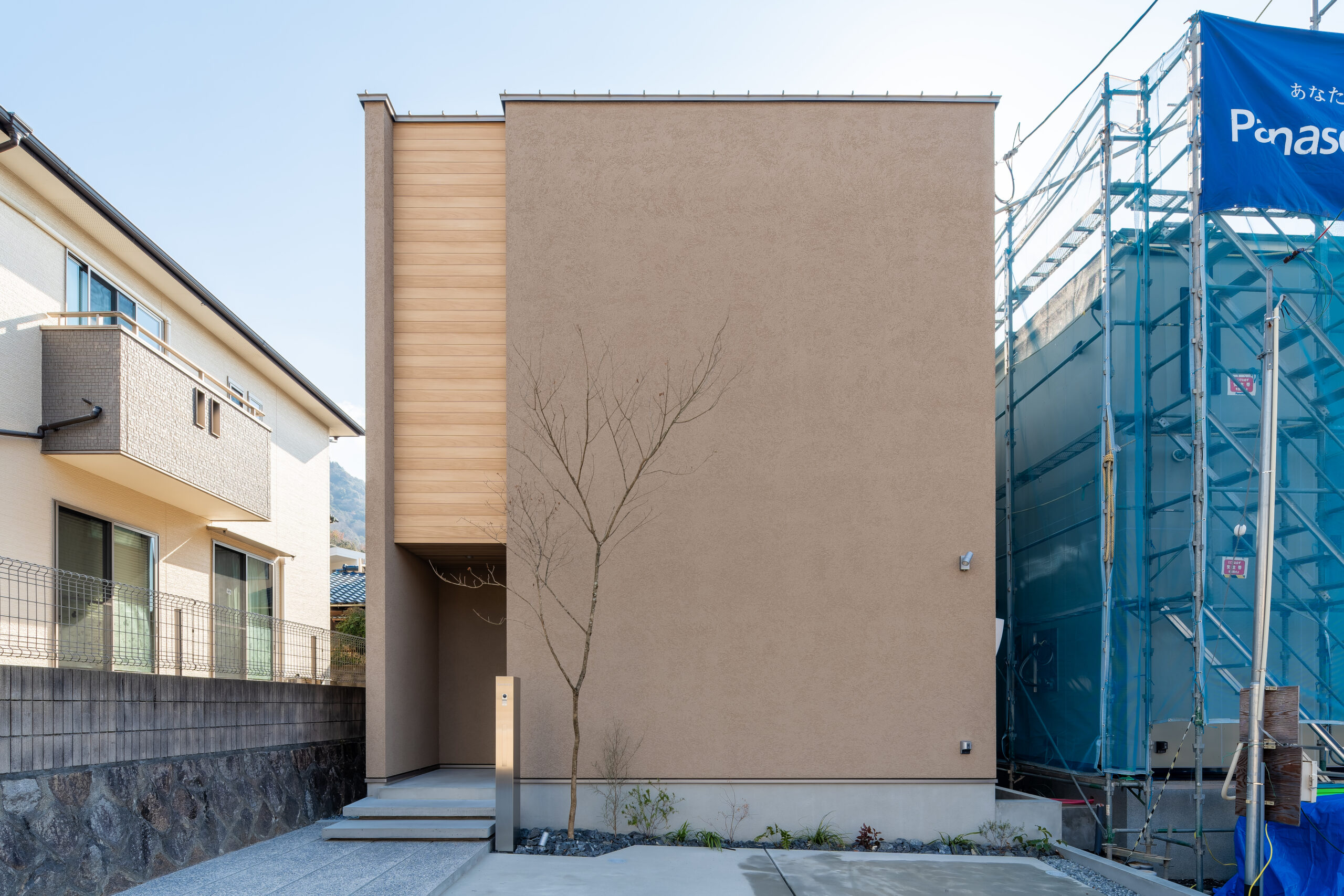 木のルーバーを設けた外観は、シンプルな形にスタイリッシュなアクセントとなる